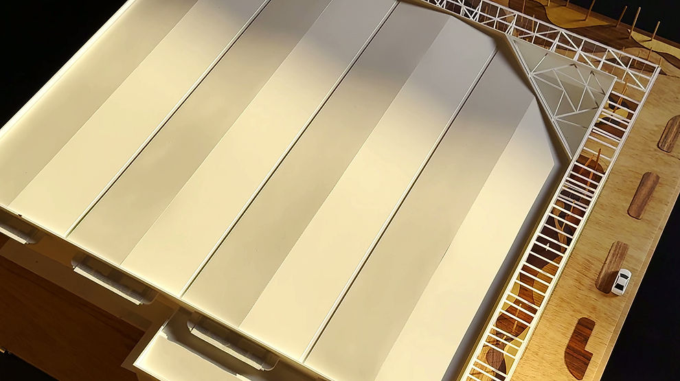 Confeccionada em acrílico, madeira e laminados, a maquete traz a volumetria do edifício, as fachadas removíveis de vidro estruturado e a composição paisagística em variadas lâminas de madeira.